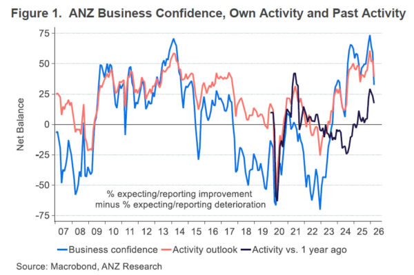 The hit to morale was offset by a slowdown in activity expectations. Private activity expectations fell from 52.6 to 39.3, indicating that companies are already seeing a decline in demand as decision-making is postponed. ANZ noted that although the recovery had begun to take hold earlier in the year, conditions had changed rapidly, with businesses reporting an immediate impact on activity as uncertainty increased.