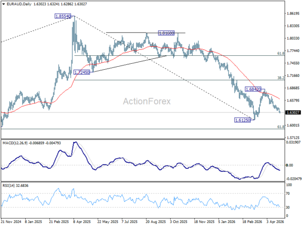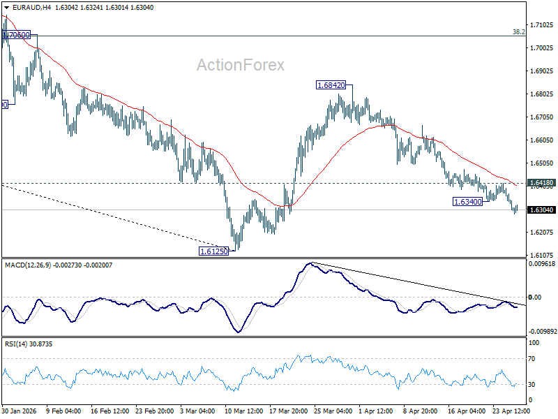 The intraday bias for EUR/AUD has returned to the downside with the breakout of the interim low at 1.6340. A drop from 1.6842 should target a retest of the low of 1.6125. A strong breakout there will resume the downtrend greater than 1.8554. On the upside, minor resistance above 1.6418 will shift the intraday bias back to neutral first.