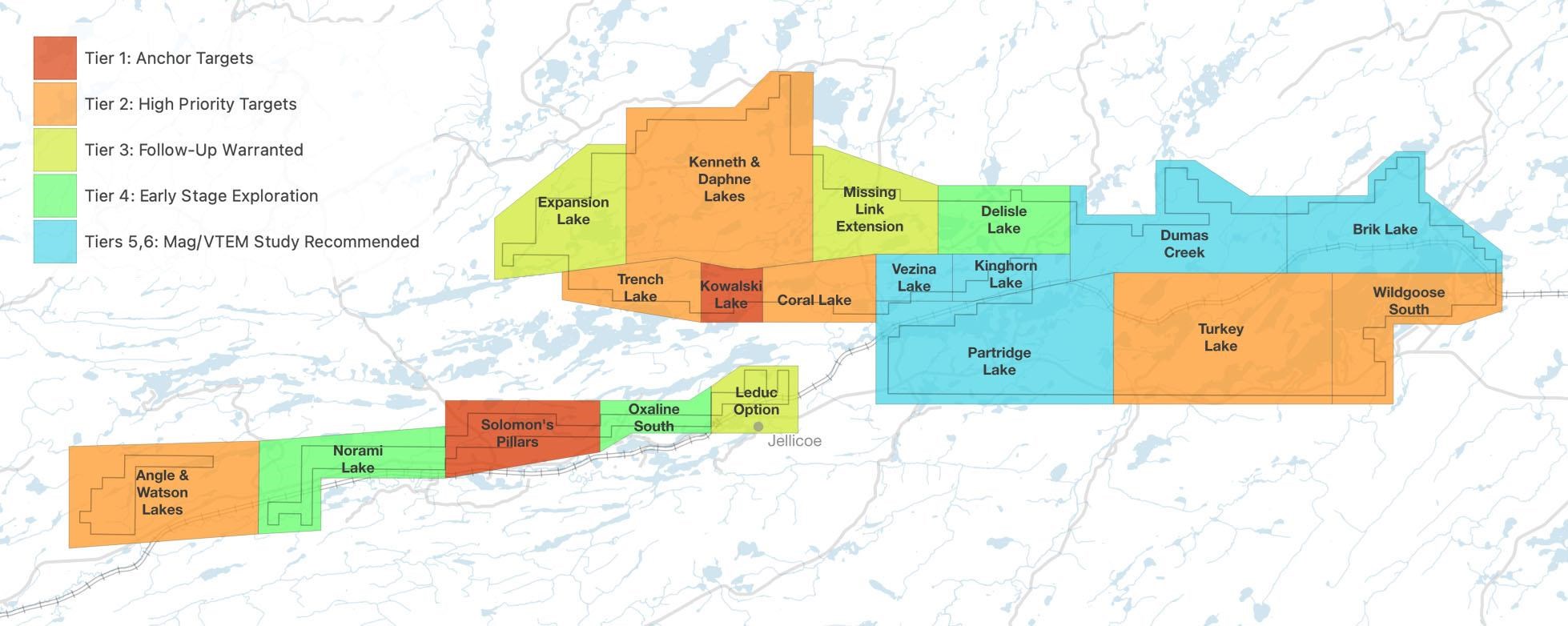 - Coral Lake: Anomalous drilling results within a structurally complex area east of Lake Kowalski. There is no recent follow-up.