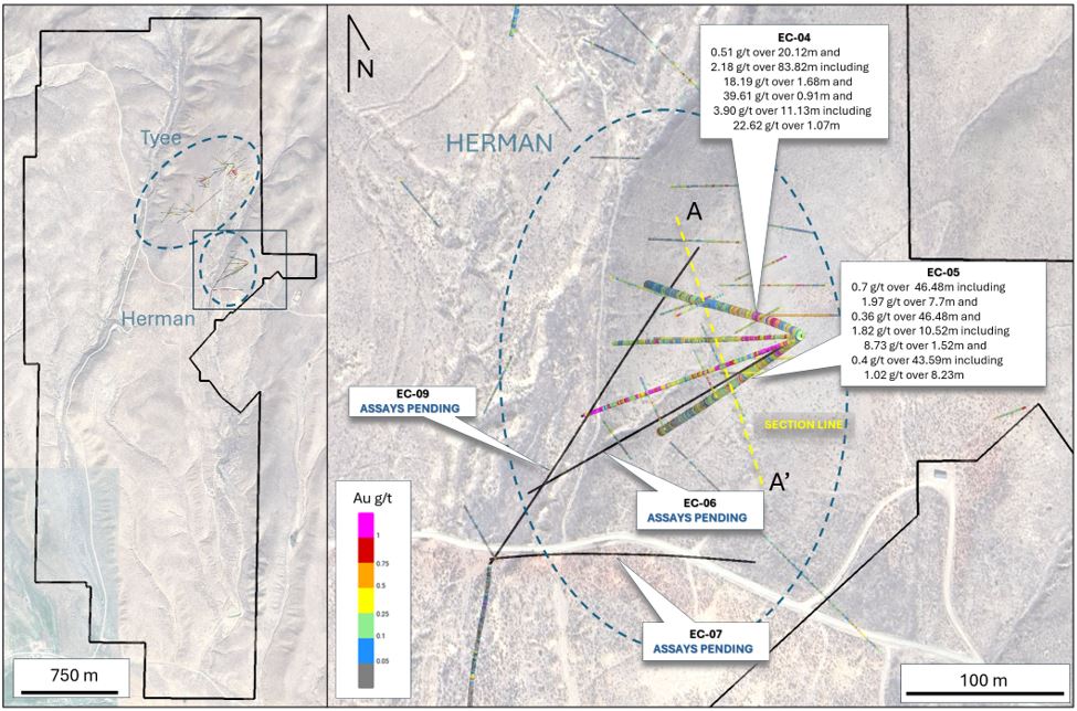 Diamond drill holes EC-04 and EC-05 followed up drilling results from ED-27 and ED-28 (see press release dated 8 October 2025) and confirmed that strong gold mineralization continues both north and south in the Hermann Zone, intersecting with extensive gold mineralization that includes high-grade zones and is hosted in contact zones, structures and mineralized breccias between the host and various sedimentary rocks. Intrusions. (Figure 1-2, Table 1).