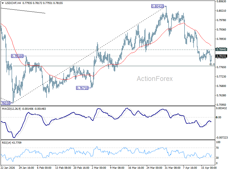 The extended decline of USD/CHF last week indicates that the rebound from 0.7603 has been completed as a corrective move to 0.8041. The initial bias remains to the downside this week. A sustained break of the 61.8% retracement levels from 0.7603 to 0.8041 at 0.7770 will pave the way for a retest of the bottom at 0.7603. On the upside, minor resistance above 0.7844 will shift the intraday bias to neutral first.